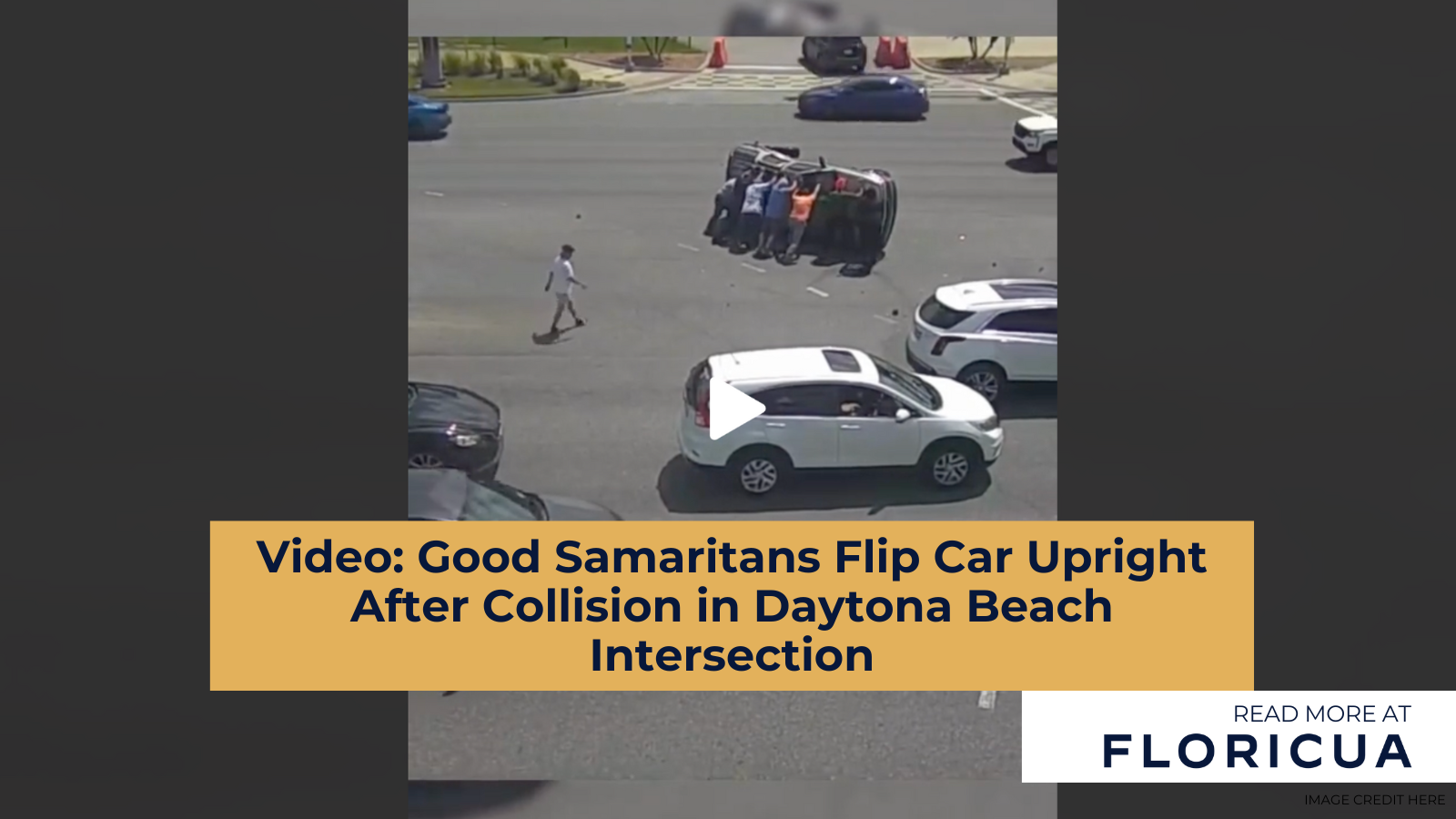 @floricuas Several people demonstrated the “spirit of Daytona Beach” when they flipped an SUV back upright after it collided with another car on Tuesday, March 26, police in Florida said. Video released by the Daytona Beach Police Department shows the moment several Good Samaritans rushed over to a car that was lying on its side after the crash, and worked together to push the car back up onto its wheels. There were no serious injuries as a result of the accident, police said. Credit: Daytona Beach Police Department via Storyful